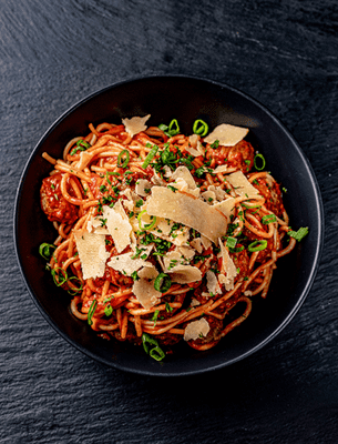Delicious tender beef meatballs in a marinara sauce on fresh linguine. Finished with parmesan, spring onion and fresh herbs