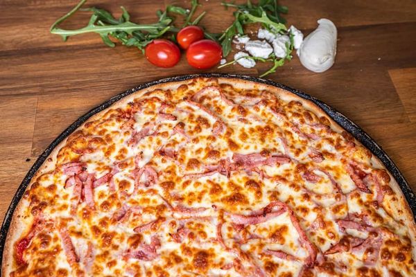 Tomato Base, Bacon, Pepperoni, Olives and Mozzarella.