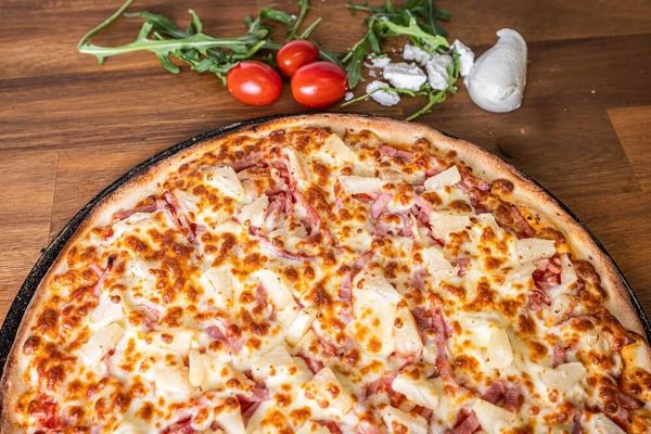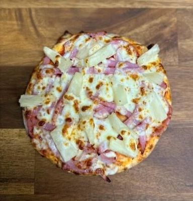 Tomato Base, Ham, Pineapple and Mozzarella.