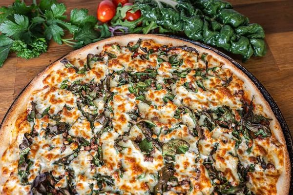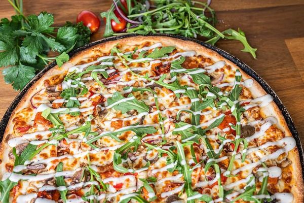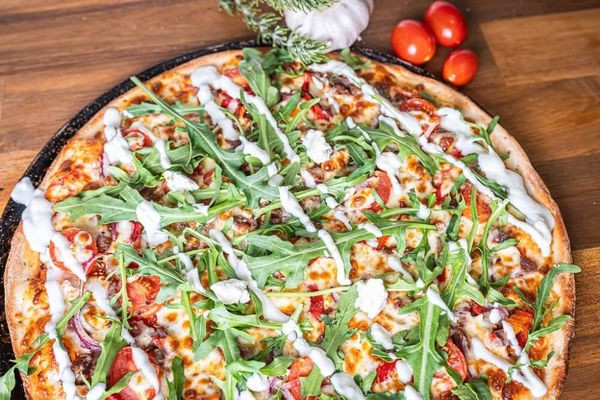 Tomato Base, Capsicum, Mushroom, Olives, Pumpkin, Semi-Dried Tomatoes, Onion, Feta, Mozzarella, Ranch Swirl and Rocket.