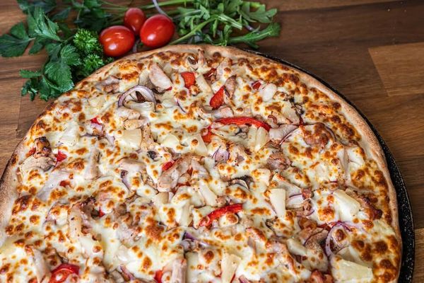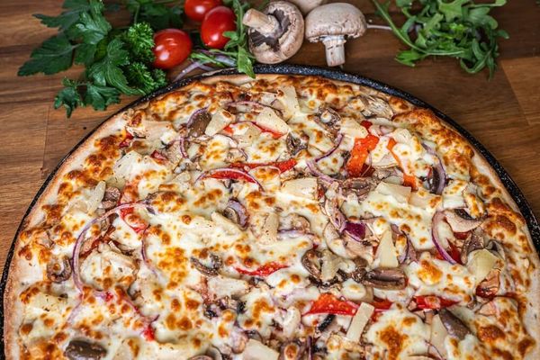 Tomato Base, Roasted Chicken, Capsicum, Mushroom, Pineapple, Onion and Mozzarella.