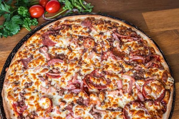 Tomato and BBQ Base, Bacon, Beef, Chorizo, Ham, Pepperoni, Salami and Mozzarella.