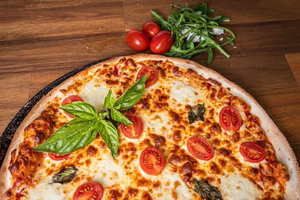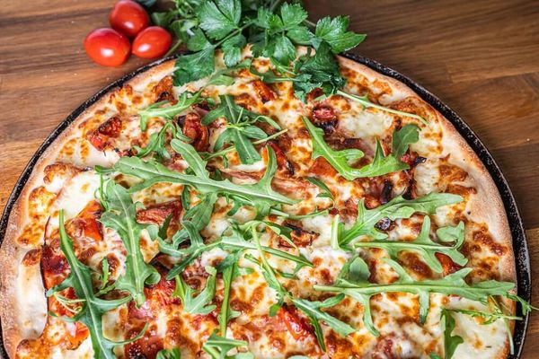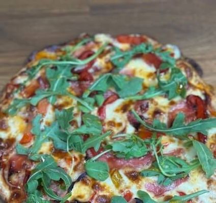 "The Ironman" Tomato base, Mozzarella, prosciutto, roasted capsicum and Chilli finished with rocket and a hot chilli honey drizzle