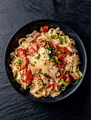 Creamy white wine sauce, mushrooms, bacon, onion, garlic, linguini. Finished with parmesan, spring onion and herbs