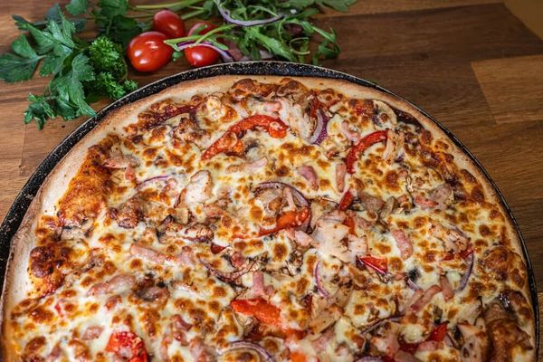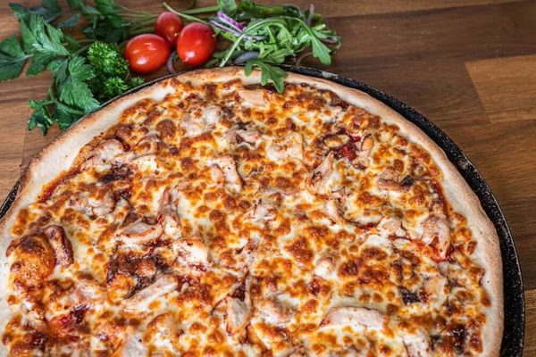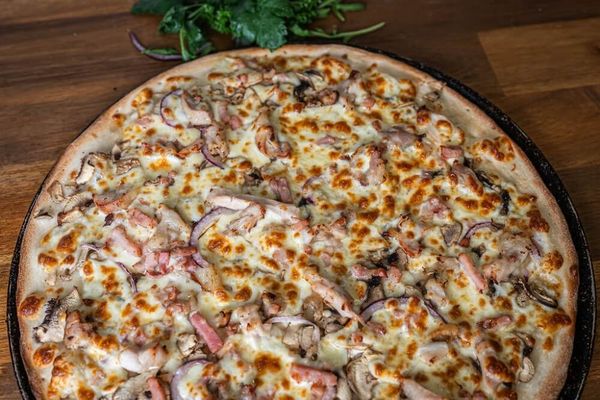 Tomato and BBQ Base, Bacon, Roasted Chicken, Capsicum, Mushroom, Onion and Mozzarella.