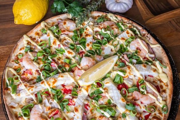 Bechamel Base, Bacon, Roasted Capsicum, Onion, Mozzarella, Calamari, Crab Meat, Green Prawns, Cracked Pepper, Garlic, Hollandaise Swirl and Lemon.