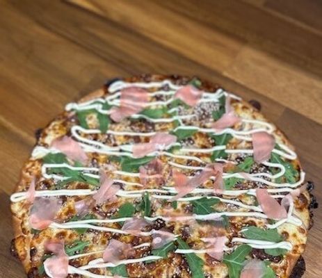 Sweet Soy Base, Beef, Sesame Oil, Red Onion, Mozzarella, Pickled Ginger, Creamy Kewpie Mayo, Toasted Sesame Seeds and Rocket.