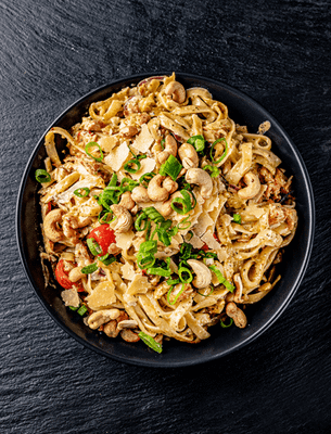 Creamy white wine and basil pesto sauce, roast chicken, onion, cherry tomatoes, garlic, linguini. Finished with cashews, parmesan, spring onion & fresh herbs