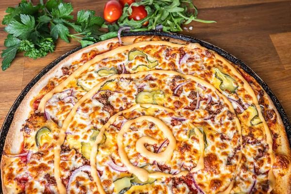 Tomato Base, Beef, Burger Pickles, Onion, American Cheese, Mozzarella and Johnny's Signature Burger Swirl.