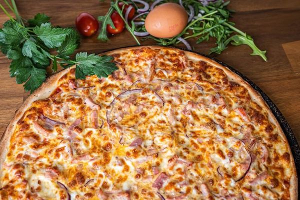 Tomato Base, Bacon, Egg, Onion and Mozzarella.